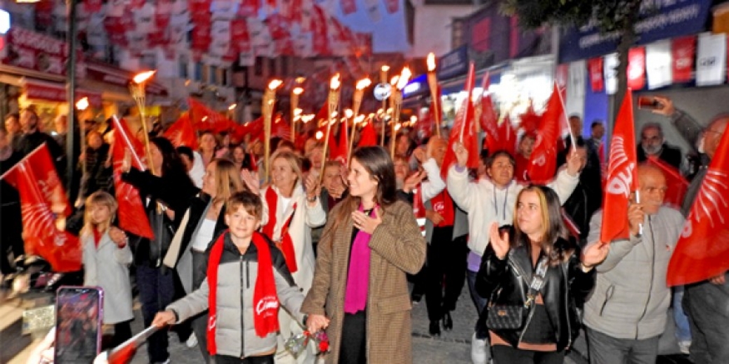 Mehmetçik Parkı'ndan başlayan ve Cumhuriyet Meydanı'na kadar devam eden yürüyüşe çok sayıda Çeşmeli kadın, ellerinde meşaleler ve CHP bayrakları ile katıldı.