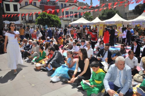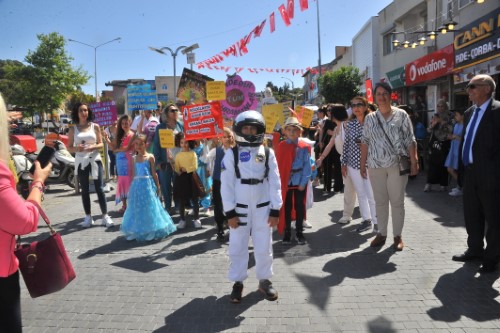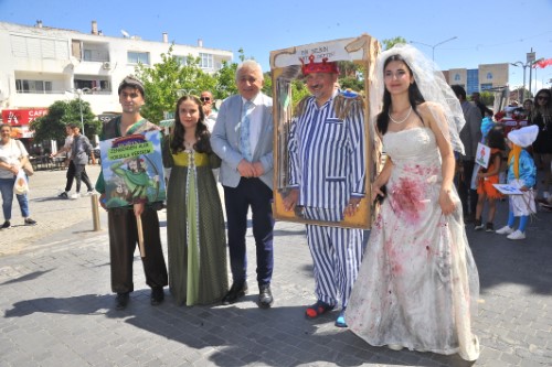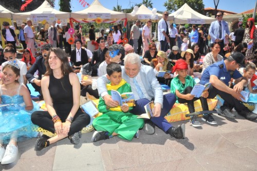 Çeşme'de, "Hayatın Anlamı Kitap" projesi kapsamında gerçekleştirilen "Kitap Takas Şenliği" renkli görüntülere neden olurken, çocuklar, 100'ün üzerinde kitap kahramanını da canlandırdılar.